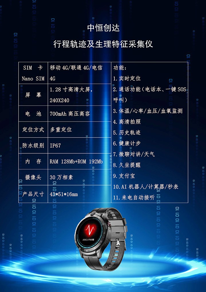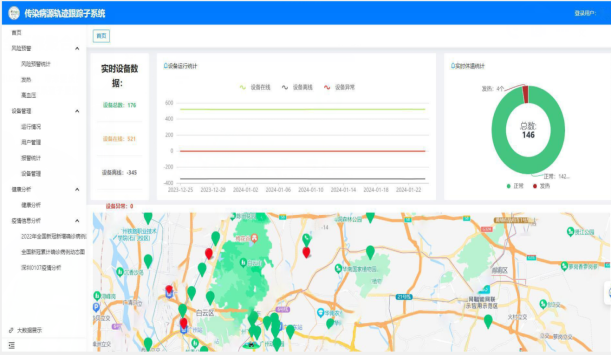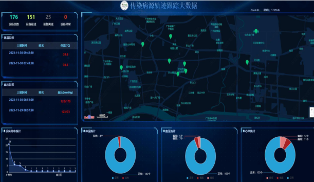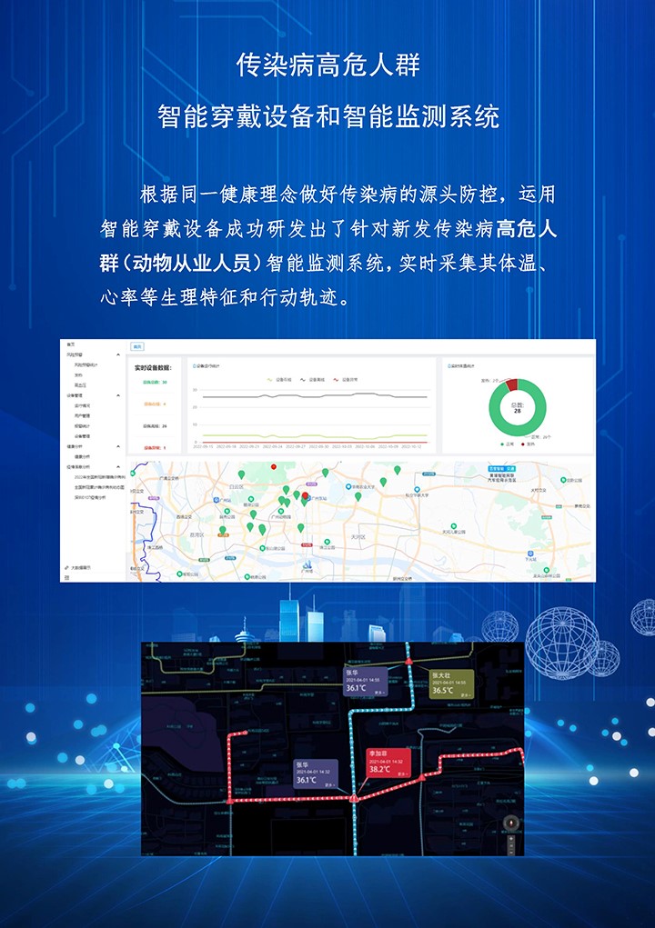 智能穿戴设备和智能监测系统:运用智能穿戴设备成功研发出了针对新发传染病高危人群智能监测系统,该系统针对传染病高危人群进行智能监测,实时采集其体温、心率等生理特征和行动轨迹,完成数据可视化呈现,实现对监测数据的动态快速统计分析与疾病爆发信息的早期监测,为人体健康保驾护航。